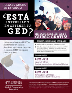 FreeCollege of the Redwoods (CR) offers GED preparation with support in Spanish, typically through their Adult Education program, providing classes in all four GED subject areas (Language Arts, Math, Social Studies, Science) in Spanish.